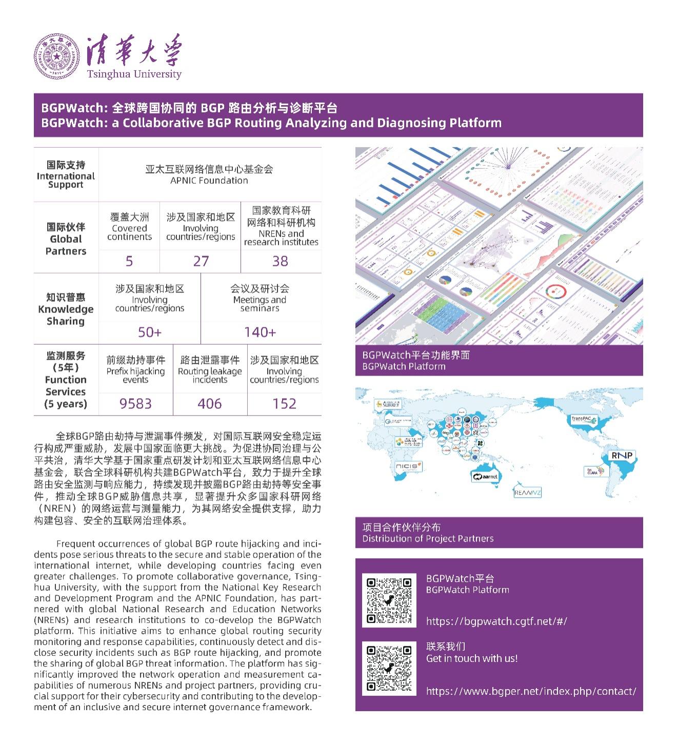 11月6日下午,2025年“携手构建网络空间命运共同体精品案例”在浙江乌镇世界互联网大会上发布,清华大学的“BGPWatch:全球跨国协同的BGP路由分析与诊断平台”入选12个精品案例。